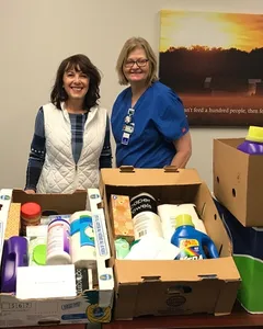Regional Cancer Center nurse Gail Cook, RN, was especially grateful for the donation of cleaning supplies for those who struggle to make ends meet while undergoing treatment. Figgins (left) and Cook are pictured with some of the supplies.