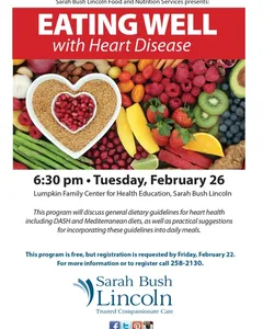 For a person with heart disease, eating a healthy diet is essential to managing symptoms. Learn how to focus on the positives of heart healthy eating during a program entitled “Eating Well with Heart Disease” hosted by Sarah Bush Lincoln’s Food and Nutrition Services.